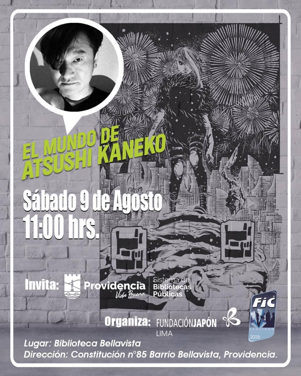 Como punto de partida de las actividades, el próximo sábado 9 de agosto se realizará un encuentro con el destacado artista mangaka e ilustrador japonés Atsushi Kaneko a las 11:00 horas en la Biblioteca Bellavista, ubicada en calle Constitución N° 85, Providencia. La actividad está organizada por la Fundación Japón Lima y cuenta con el apoyo del Sistema de Bibliotecas Públicas de Providencia.
