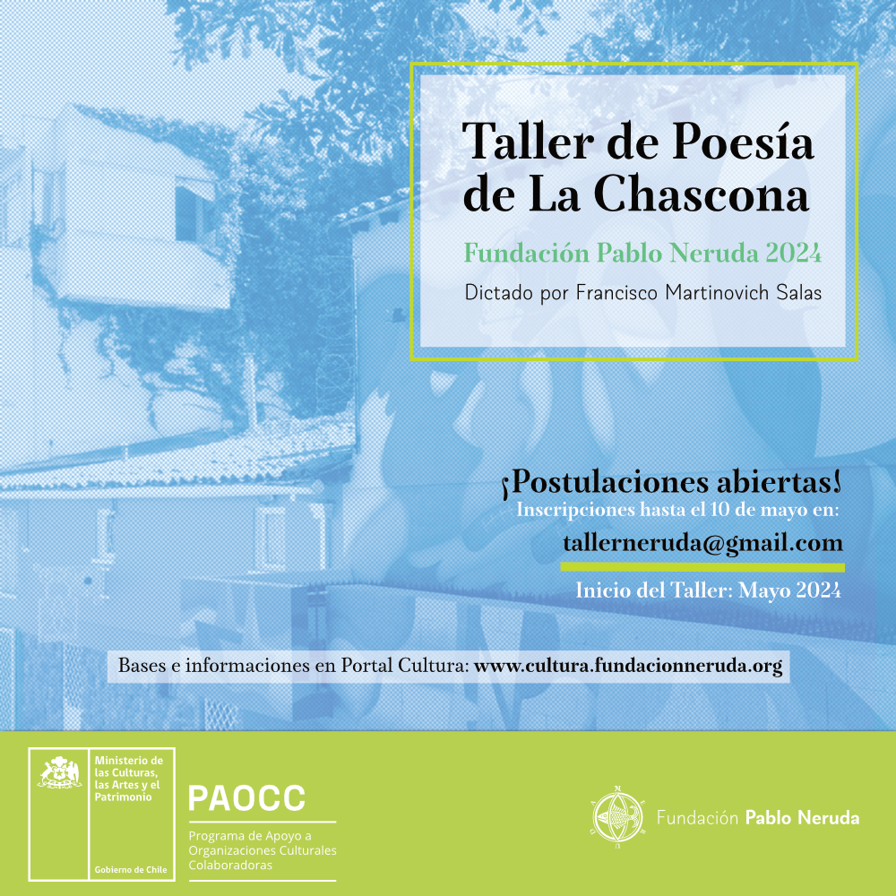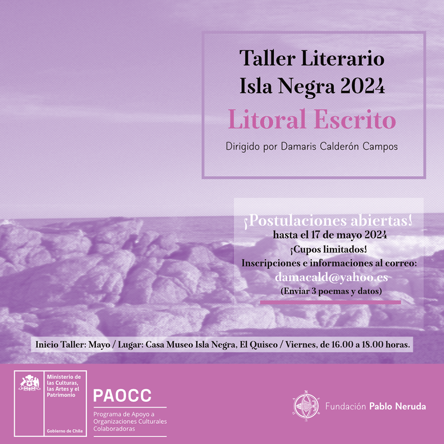 Los talleres son parte del programa PAOCC 2024 con el que Fundación Pablo Neruda ofrece a la comunidad diversas actividades culturales en forma gratuita y están dirigidos a distintos públicos. En el caso del Taller La Chascona, impartido por el poeta y docente Francisco Martinovich Salas, estará drigido a jóvenes poetas de nacionalidad chilena o extranjera residentes en Chile, de entre 18 y 25 (inclusive) años de edad, en tanto que el de Isla Negra, impartido por la poeta Damaris Calderón, estará dirigido a adultos sin límites de edad.